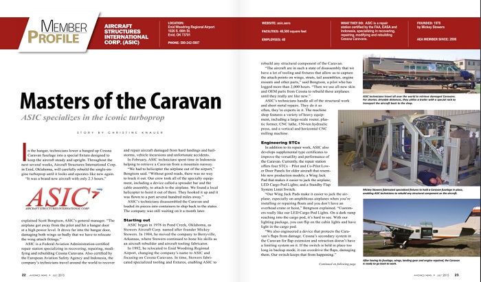 Services Aircraft Structures International Corporation (ASIC) is a Licensed Repair Station with the FAA (YS1R649K), EASA (EASA.145.5989) and Indonesia (145/87700). Our 68,950 sq. ft. facility is centrally located in the US at Enid, Oklahoma. ASIC has repaired aircraft and structural components ranging from the Cessna 150 to the Gulfstream III and has gained the reputation of being the world leader in rebuilding the Cessna Caravan.
